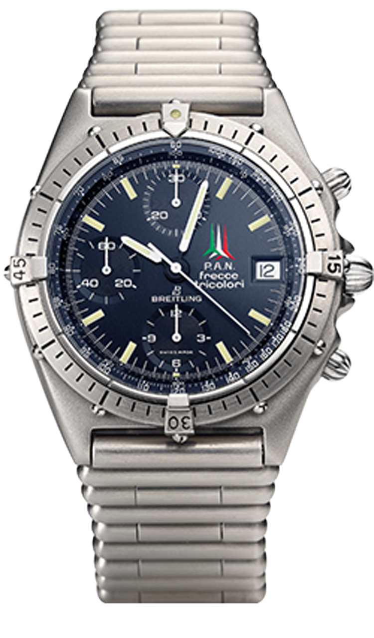 1980年代初頭、ブライトリングはイタリア空軍のフレッチェ・トリコローリ・ジェットチームが、コックピットで使える頑丈でスリムな機械式クロノグラフを求めていることを知りました。特に風防破損の問題を解決するため、ベゼルに隆起した「ライダータブ」を配置。これに感銘を受けたチームの依頼で、1984年にクロノマットが発売され、ライダータブとオニオン型リュ-ズ、金属製ルーローブレスレットがクロノマットの象徴となりました。