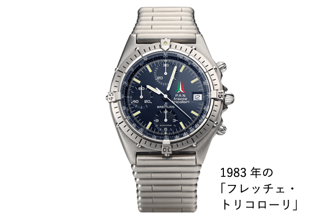 1980年代初頭、ブライトリングはイタリア空軍のフレッチェ・トリコローリ・ジェットチームが、コックピットで使える頑丈でスリムな機械式クロノグラフを求めていることを知りました。特に風防破損の問題を解決するため、ベゼルに隆起した「ライダータブ」を配置。これに感銘を受けたチームの依頼で、1984年にクロノマットが発売され、ライダータブとオニオン型リュ-ズ、金属製ルーローブレスレットがクロノマットの象徴となりました。